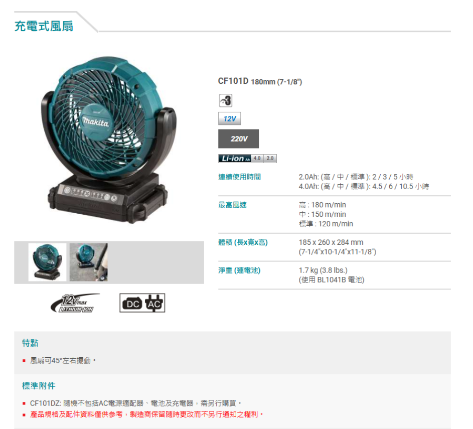 4.0Ah: (高 / 中 / 標準 ): 4.5 / 6 / 10.5 小時
